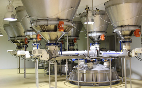 此系統主要應用真空輸送投料、真空輸送包裝、螺桿輸送計量,完成干混系統自動化。計劃表制定好后啟動干混系統,整個系統分為四大部分,分別為送粉、粉倉計量、干混、包裝。
